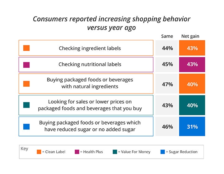 Clean label, health plus – or the inclusion of health benefits – and sugar reduction have seen the strongest net gain in consumer buying behavior over the past year. Consumers are also checking perceived value for money through sales.